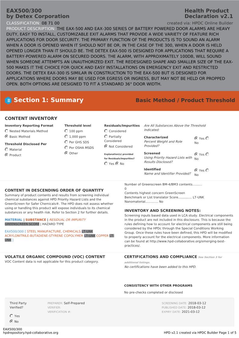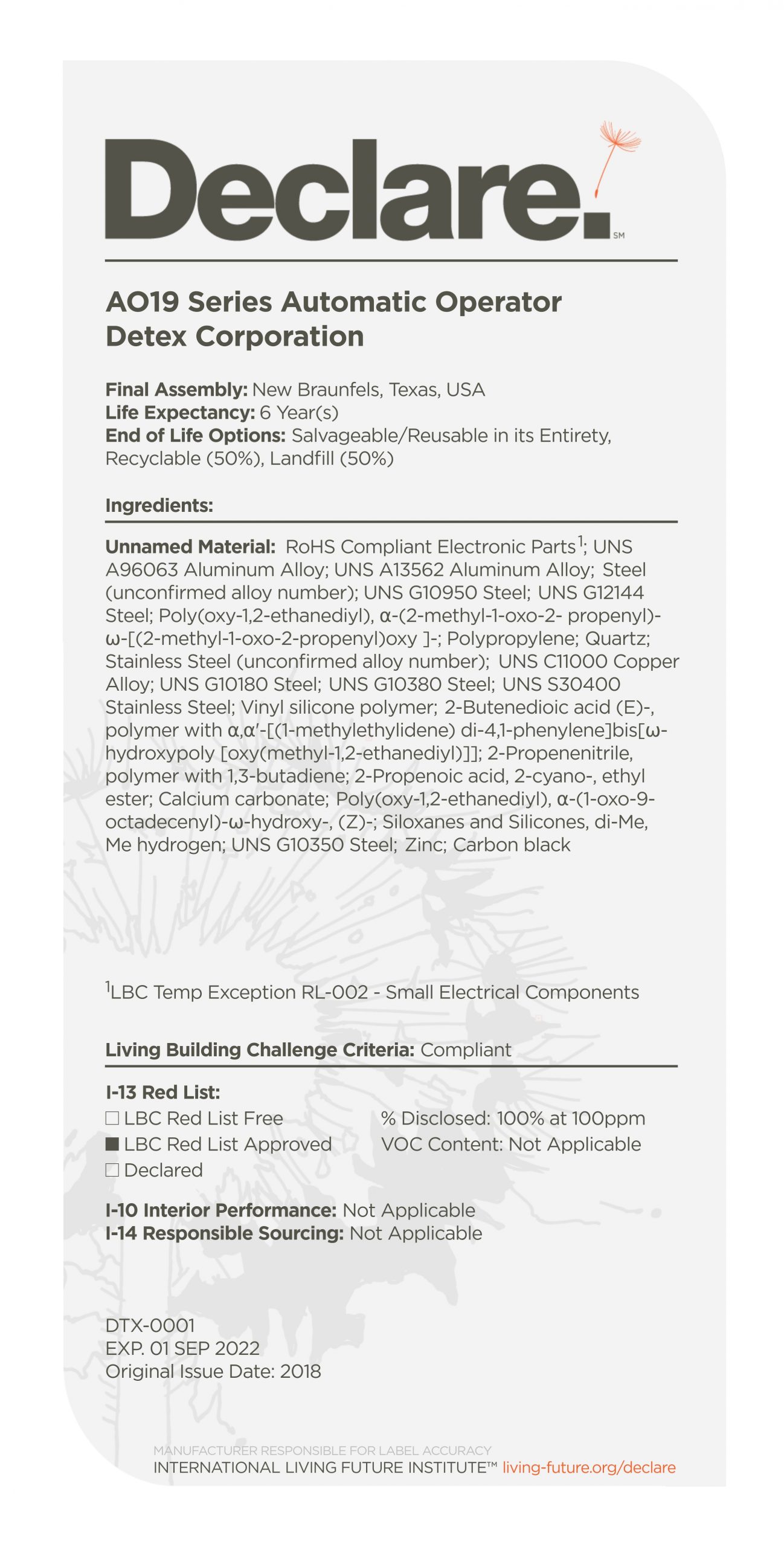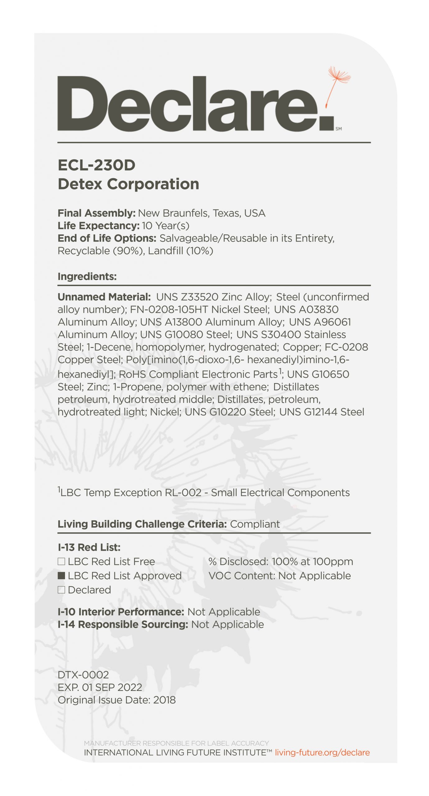A self-published disclosure of chemicals and ingredients used in each Detex Product. Each HPD is developed in accordance with the Health Product Declaration Collaborative’s Open Standard and describes product contents and each ingredient’s relationship to human and ecological health.