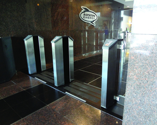 With sleek and attractive designs, the ES8500 mid-sized optical turnstiles are ideal for small to mid-sized lobbies or entry applications that require pleasing aesthetics. The ES8500 pedestals ensure controlled access by forming pedestrian walkways and monitoring high levels of pedestrian traffic at up to 60 people per minute per lane. Access is controlled by sensors that allow one person to enter for each I.D. card that is presented, and an alarm is triggered by unauthorized access.